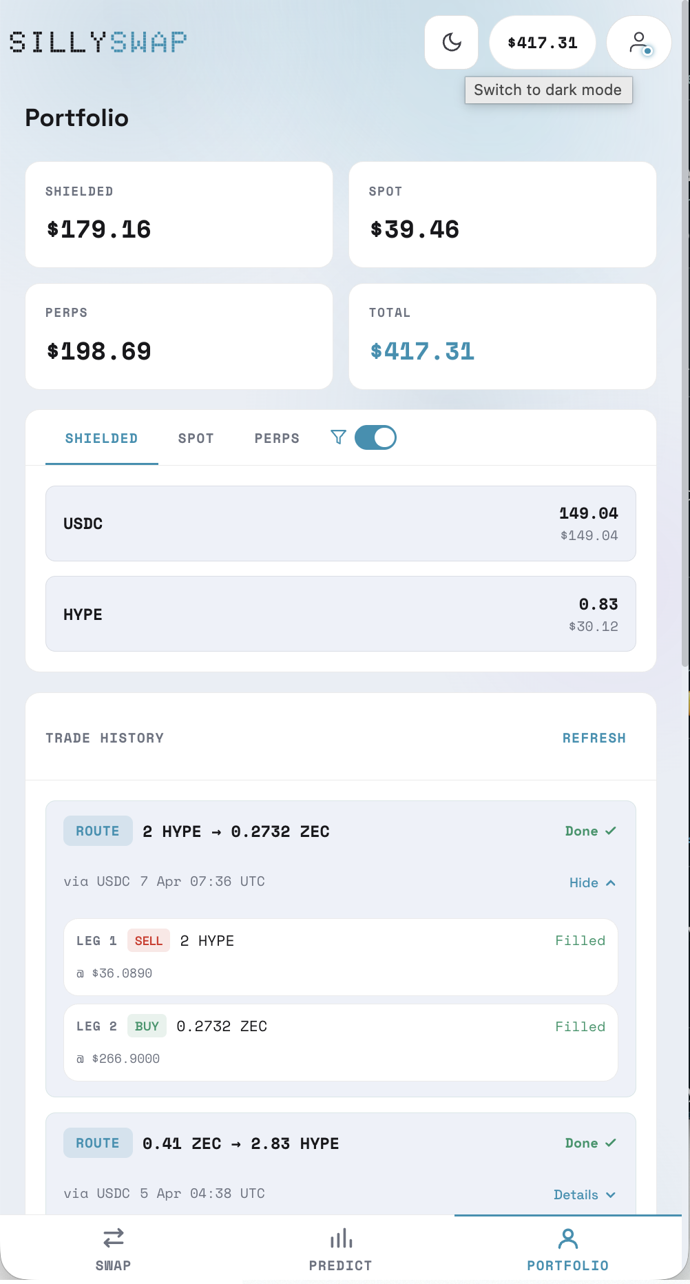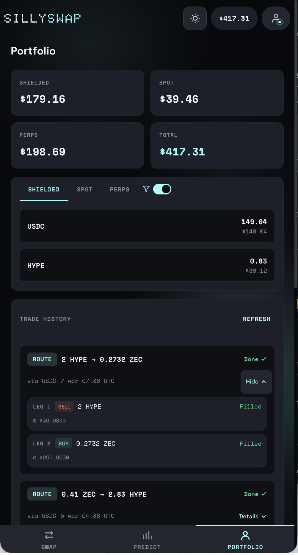 The Portfolio page shows your balances and trade history across all SillySwap accounts.